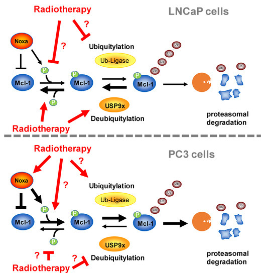 Regulation of Mcl-1 protein levels in LNCaP and PC3 prostate cancer cells. Mcl-1 protein levels are higher in LNCaP cells than in PC3 cells due to reduced polyubiquitylation and reduced proteasomal degradation. Upper panel: After irradiation, less Mcl-1 is phosphorylated and polyubiquitylated, resulting in increased Mcl-1 protein stability in LNCaP cells. Deubiquitinase contributes to increased Mcl-1 protein stability, but it remains unclear whether irradiation also blocks ubiquitylation of Mcl-1. It also remains unclear whether inhibition of phosphorylation or increased dephosphorylation is responsible for decreased phospho-Mcl-1 levels in LNCaP cells after irradiation. Lower panel: Mcl-1 protein stability is decreased in PC3 cells after irradiation due to increased polyubiquitylation and proteasomal degradation. Radiotherapy results in upregulated Noxa levels, thus facilitating Noxa-dependent polyubiquitylation and degradation of Mcl-1. It remains unclear whether radiotherapy also increased ubiquitin ligase activity and protein levels or blocked deubiquitylating activity. In the regulation of Mcl-1 levels, USP9x plays a less important role in PC3 cells than in LNCaP cells. Radiotherapy also increased phospho-Mcl-1 levels, but it is unclear to what extent radiotherapy facilitates phosphorylation and/or decreased dephosphorylation.