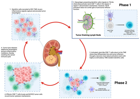 The renal cell carcinoma cancer immune cycle. Depiction of the immune response cycle to renal cell carcinoma. Dendritic cells (DCs) and other antigen presenting cells (APCs) are recruited to the tumor microenvironment where renal cell carcinoma (RCC) tumor neoantigens are captured, processed and then presented by DCs and APCs on MHC I and MHC II molecules (step 1). DCs and other APCs migrate to tumor draining lymph nodes (TDLNs), where they present tumor neoantigens to T cells (step 2). Naïve CD8+ T cells undergo a two-phase process to gain effector functions (as proposed by Prokhnevska et al. [16]). In phase 1, naïve CD8+ T cells become activated stem-like CD8+ T cells, which migrate to the tumor microenvironment and have the ability to replicate but do not yet possess effector functions. In phase 2, the stem-like CD8+ T cells differentiate into effector cells by a second co-stimulatory signal from tumor resident DCs. These terminally differentiated effector CD8+ T cells target and destroy tumor cells (step 4). This releases more RCC neoantigens, further potentiating the cancer immune cycle (step 5).