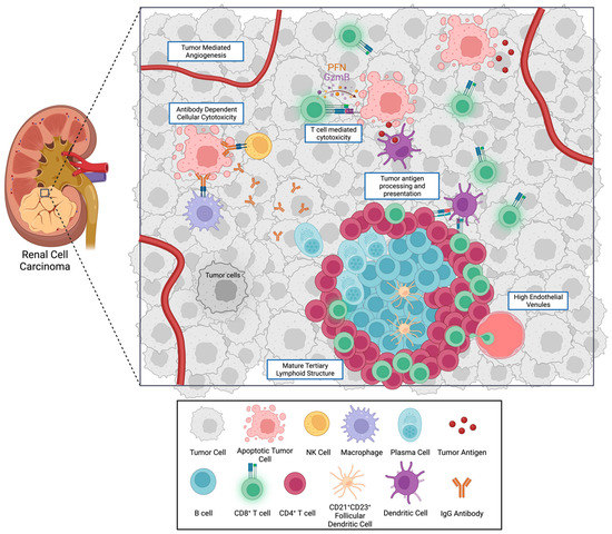 How cells interact and organize in the TME is important for an effective immune response. Tertiary lymphoid structures (TLSs) have been increasingly recognized as possible sites of tumor antigen recognition and generation of adaptive immune responses locally within the TME [44,52,53,54,55,56,57,58,59,60,61,62,63,64]. Tertiary lymphoid structures are organized aggregates of immune cells that arise, unlike lymph nodes, postnatally in non-lymphoid tissues [62]. The organization of TLS consists of an inner zone of CD20+ B cells surrounded by T cells, mimicking lymph follicles of secondary lymphoid organs (Figure 2) [55,62]. T cells within TLSs consist of CD4+ TFH, TH1, Tregs and CD8+ cytotoxic T cells. CD21+CD23+ follicular dendritic cells are also present. The TLS is surrounded by specialized blood vessels called high endothelial venules (HEVs) that promote lymphocyte extravasation into the TME [54]. Tertiary lymphoid structures appear to have the ability to generate adaptive immune responses to tumor cells independent of more distant tumor draining lymph nodes. Mice lacking secondary lymphoid organs can still generate antitumor immune responses including effective T cell priming within intratumor TLS [55]. In RCC specifically, spatial transcriptomic analyses of primary tumor samples have shown TLSs to be sites of plasma cell maturation, which then migrate from TLS into the nearby TME guided by local fibroblast chemokines [44]. The plasma cells secrete IgG antibody which then binds and induces tumor cell apoptosis, possibly through a macrophage induced mechanism as evidenced by the higher infiltration of CD68+ macrophages surrounding IgG bound tumor cells [44]. Tertiary lymphoid structures and B cells localized within TLSs also appear to promote ICI response. Higher expression of B cell related genes was shown to be present in metastatic RCC tumors responsive to ICI. These intratumoral B cells were shown to localize within TLSs, and patients with higher TLS density were more likely to respond to ICI therapy [64].