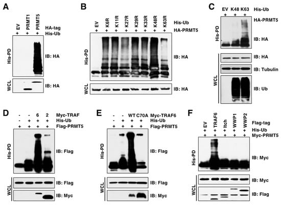 Ubiquitination is one of the most common PTMs and serves as a key mechanism controlling protein functions []. However, whether and how PRMT5 is regulated by ubiquitination remains largely unknown. To address this question, we performed in vivo ubiquitination assay under denaturing conditions, which disrupts PRMT5 interactions with all its binding partners to exclude possible interferences from their ubiquitination. Strikingly, compared to PRMT1 (the main type I enzyme), PRMT5 was heavily ubiquitinated in cells (Figure 1A). To identify the ubiquitin linkage of PRMT5, we co-transfected PRMT5 with a panel of ubiquitin mutants, in which the indicated lysine (K) was mutated to arginine (R) []. The ubiquitin K63R mutation, and to a lesser extent the K27R mutation, decreased PRMT5 ubiquitination (Figure 1B). In contrast, co-transfection of PRMT5 with K63-only ubiquitin—but not K48-only ubiquitin, in which only the indicated lysine is not mutated—conferred PRMT5 ubiquitination (Figure 1C). To identify the E3 ubiquitin ligase(s) responsible for the K63-linked ubiquitination of PRMT5, we focused on the E3 ligases of TRAF and NEDD4 families, which prefer to catalyze ubiquitination with the K63 linkage [,]. We found that TRAF6, but not its close member TRAF2 or the E3-ligase-inactive mutant TRAF6-C70A [], promoted PRMT5 ubiquitination (Figure 1D,E). Compared to TRAF6, the members of the NEDD4 family, including Itch, WWP1, and WWP2, failed to promote PRMT5 ubiquitination (Figure 1F). These results suggest that TRAF6 is the main E3 ubiquitin ligase responsible for K63-linked ubiquitination of PRMT5.