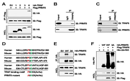 TRAF6 interacts with PRMT5 via the TRAF6-binding motifs. (A) IB analysis of WCL and Flag immunoprecipitation (IP) products derived from HEK293T cells transfected with Flag-PRMT5 and HA-tagged TRAF plasmids. (B,C) IB analysis of Input and TRAF6 IP or PRMT5 IP products derived from MDA-MB-231 cells. (D) Protein sequence of TRAF6-binding motifs of PRMT5. (E) IB analysis of WCL and HA IP products derived from MDA-MB-231 cells stably expressing HA-PRMT5-WT or HA-PRMT5-3A. EV (empty vector) is a negative control. (F) IB analysis of WCL and His-PD products derived from HEK293T cells transfected with indicated plasmids. The original blots image for Figure 2 is available in Supplementary Materials.
