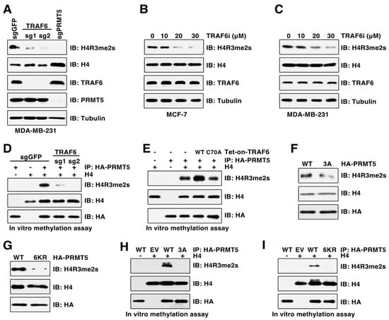PRMT5 ubiquitination is critical for its activity. (A) IB analysis of WCL and histones derived from MDA-MB-231 cells infected with viruses expressing control sgGFP, TRAF6 sgRNA, or PRMT5 sgRNA. (B,C) IB analysis of WCL and histones derived from cells treated with indicated TRAF6 inhibitor, C25–140, for 3 days. (D,E) In vitro arginine methylation assays using recombinant histone H4 as substrate. (F,G) IB analysis of WCL and histones derived from MDA-MB-231 cells expressing HA-PRMT5-WT, 3A or 6KR. (H,I) In vitro arginine methylation assays using recombinant histone H4 as substrate. The original blots image for Figure 4 is available in Supplementary Materials.