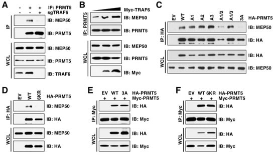 PRMT5 ubiquitination is required for its interaction with MEP50. (A) IB analysis of WCL and PRMT5 IP derived from MDA-MB-231 cells with or without TRAF6 depletion. (B) IB analysis of WCL and PRMT5 IP derived from HEK293T cells transfected with TRAF6. (C,D) IB analysis of WCL and HA IP derived from HEK293T cells transfected with indicated plasmids. (E,F) IB analysis of WCL and Myc IP derived from HEK293T cells transfected with indicated plasmids. The original blots image for Figure 5 is available in Supplementary Materials.