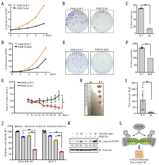 Our previous study demonstrated that depletion of PRMT5 significantly suppressed breast cancer cell proliferation and tumor growth []. To investigate the biological function of TRAF6-mediated PRMT5 ubiquitination, we reintroduced PRMT5-WT, PRMT5-3A, or PRMT5-6KR into PRMT5-depleted breast cancer cells. Cell proliferation assays showed that, compared to cells expressing PRMT5-WT, cells expressing PRMT5-3A or PRMT5-6KR displayed a significant decrease in cell proliferation (Figure 6A,D). Consistently, colony formation was significantly decreased in cells expressing these PRMT5 mutants compared to PRMT5-WT (Figure 6B,C,E,F). Moreover, the mouse xenograft assay showed that compared to PRMT5-WT, PRMT5-3A mutation significantly suppressed tumor growth (Figure 6G–I). Lastly, we found that, compared to the single agent, co-treatment of TRAF6 and PRMT5 inhibitors significantly decreased cell viability in breast cancer cells (Figure 6J), which is in part achieved by enhancing cell apoptosis (Figure 6K). These data suggest that TRAF6-mediated ubiquitination of PRMT5 is important for its proliferative function in breast cancer cells.