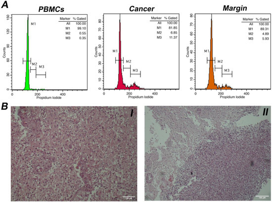 (A). DNA analysis with intraoperative Flow Cytometry in a case of a glioblastoma (WHO grade IV). Markers M1, M2, and M3 correspond to cells in phase G0/G1, S, and G2/M, respectively. Left histogram: distribution of peripheral blood mononuclear cells/PBMCs (in green), middle histogram: distribution of malignant cells (in red). The presented case is diploid, with a DNA index = 1 and a tumor index of ~18%; right histogram: a tumor margin (in orange) with index of ~11%. (B). I. Histological section of a case of glioblastoma (Hematoxylin & Eosin stain, original magnification × 100). II. Neoplastic cells infiltrate normal glial tissue at the peripheral borders of the tumor (Hematoxylin & Eosin stain, original magnification ×40). Scale bars (100 μM) are present in lower right part of each figure.