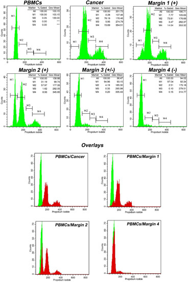 Tumor characterization and margin evaluation in a case of high-grade glioma using intraoperative flow cytometry (iFC). Following PI-staining, DNA was quantified in a flow cytometer. DNA quantity in cell populations of peripheral blood mononuclear cells (PBMCs), cancer, and margins are presented in respective plots. Marker M1 in PBMCs sample denotes cells in G0/G1 cell cycle phase. In cancer sample, Markers M2, M3, and M4 correspond to G0/G1, S, and G2/M cell cycle phases. Tumor index and DNA index quantified, based on the results obtained by iFC and presented in the upper right in each respective fluorescence plot (*** represents absence of cells in the respective marker). In our case, the tumor index has been calculated as ~22% (proportion of cells in S and G2/M). DNA index, a measure of the DNA content and ploidy status, having normal G0/G1 of PBMCs as a reference, was calculated as ~1.75, meaning that the tumor is hyperploid. The gradual reduction in tumor index and/or DNA index in margin samples denotes margin status. The margins are sorted from positive to negative. The lower panel presents overlays of different margin samples regarding normal cells. Margin samples are represented in red in the overlay with green sample representing normal PBMCs.
