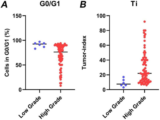 The percentage of cells in G0/G1 (A) and the respective tumor index (B) in low-grade (blue dots) versus high-grade gliomas (red dots), as quantified by iFC. Tumor index has been quantified in individual samples as the cumulative percentage of cells in S and G2/M cell cycle phases. Median percentages are shown as horizontal lines in each group.
