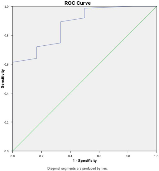 Next, the percentage of cells in each cell cycle phase was calculated. Figure 4 presents the fraction of cells in the G0/G1 phase as well as the remainder cells in S and G2/M, for which their sum is calculated in the tumor index (Ti). For all tumors, the median G0/G1 phase fraction was 78.3, the median S-phase was 6, the median G2/M phase fraction was 10.5 and the median tumor index value was 21. High-grade gliomas had a significantly higher tumor index than low-grade gliomas (median value 22 vs. 7.5, respectively, p = 0.002) (Figure 5). Using ROC curve analysis, a cut-off value of 17% in the tumor index could differentiate low- from high-grade gliomas with a 61.4% sensitivity and 100% specificity. The (ROC) curve analysis based on the tumor index for glioma grading is illustrated in Figure 6. There were 59 diploid tumors and 22 aneuploid tumors. The results are summarized in Table 1.