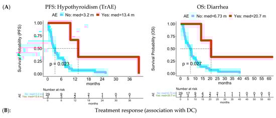 Survival outcome (Table S6): there were three toxicity categories associated with improved survival outcomes. For PFS, endocrine disorders had early low-grade AE and TrAE associated with better PFS. Hypothyroidism, a member of endocrine disorders, was a Pembrolizumab immune-related adverse event (irAE), and shared the same association (median PFS: 13.4 months (with AE event; n = 3) vs. 3.2 months (without AE event) in Figure 4A). Eye disorders also had early low-grade AE associated with better PFS. For OS, low-grade gastrointestinal disorders and its member, diarrhea, were associated with better OS (median OS for diarrhea: 20.7 months (with AE event) vs. 6.73 months (without AE event) in Figure 4A). In contrast, there were eight toxicity categories and 15 individual AEs associated with poorer survival outcomes. For PFS, six toxicity categories and six individual AEs had high-grade or any-grade AE associated with poorer PFS: gastrointestinal disorders (vomiting), general disorders and administration site conditions, infections and infestations (lung infection), musculoskeletal and connective tissue disorders (back pain), “respiratory, thoracic and mediastinal disorders” (atelectasis and dyspnea), and vascular disorders (thromboembolic event). Psychiatric disorders (confusion) and “respiratory, thoracic and mediastinal disorders” (cough, pleural effusion, and pneumothorax) had low-grade AE associated with poorer PFS. For OS, TrAEs associated with poorer OS included high-grade AE in gastrointestinal disorders, and two members, diarrhea and vomiting, and low-grade AE in alanine aminotransferase increased. In addition, there were four toxicity categories and two individual AEs had high-grade AE associated with poorer OS: blood and lymphatic system disorders (anemia), general disorders and administration site conditions, infections and infestations, and “respiratory, thoracic and mediastinal disorders” (aspiration). Psychiatric disorders also had low-grade AE associated with poorer OS.