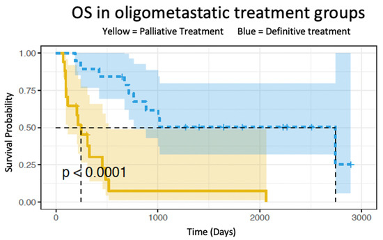 Survival graph comparing oligometastatic overall survival in patients receiving definitive chemoradiation (blue) and oligometastatic patients receiving palliative treatment (yellow).