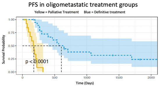 Survival graph comparing oligometastatic progression free survival in patients receiving definitive chemoradiation (blue) and oligometastatic patients receiving palliative treatment (yellow).