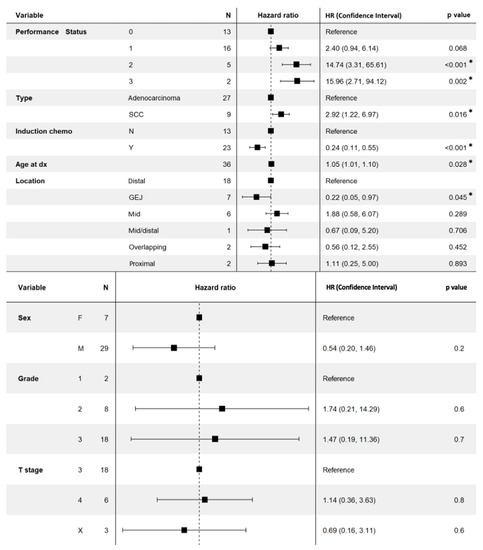 Prognostic factors association with overall survival based on univariate analysis. A “*” sign indicates p-value < 0.05 indicating the prognostic variables significant association with overall survival on univariate analysis. Hazard ratios were included in parentheses for prognostic factors that were significantly associated with overall survival. Abbreviations: Dx = diagnosis, HR = Hazard ratio, SCC = squamous cell carcinoma, GEJ = gastroesophageal junction, M = male, F = female, * = statistically significant.