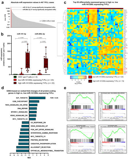 Upregulation of the miR-141/200c cluster, which is regularly seen in T-PLL cells, is associated with transcriptomes of accelerated cell cycle transition, enhanced survival signaling, and altered DNA damage responses in primary T-PLL. MicroRNA (miR) profiles were evaluated using small RNA sequencing of primary human peripheral blood-derived T-prolymphocytic leukemia (T-PLL) cells (n = 46 cases) and CD3+ healthy donor-derived pan-T-cell controls (n = 6 donors), recapitulating a previously published dataset [19]. In addition, polyA-RNA sequencing was performed on PB-isolated tumor cells from 41 miR-characterized T-PLL patients in order to align miR-141/200c expression data with those of global transcriptome alterations. (a) Bar chart displaying mean CPM values for a total of 2094 miRs detected by small RNA sequencing in at least one T-PLL patient. MiR-141-3p (mean CPM = 26,561) and miR-200c-3p (mean CPM = 3144) were among the miRs with the highest absolute CPM values and are highlighted in red. In total, 34 miRs were significantly deregulated in T-PLL cases compared to healthy donor-derived pan-T cells. (b) Relative expression of miR-141-3p and miR-200c-3p as analyzed by small RNA sequencing (RNA-seq) in primary T-PLL cells (n = 46) and healthy donor-derived CD3+ pan-T cells (dark green, n = 6). MiR-141-3p (fold change (fc) = 43.2; false discovery rate (FDR) = 0.005) and miR-200c (fc = 38.2; FDR = 0.005) are highly overexpressed in T-PLL cells. Notably, half of all sequenced T-PLL cases displayed miR-141/200c expression similar to healthy donor-derived T-cells (‘low miR-141/200c’ T-PLL subset, light red, n = 23 cases; for miR-141-3p: fc = 4.37; p = 0.98; for miR-200c-3p: fc = 3.81, p = 0.97; both one-way ANOVA, compared to healthy controls), and the other half showed marked upregulation of both miR-141-3p and miR-200c-3p (‘high miR-141/200c’ T-PLL subset, dark red, n = 23 cases; for miR-141-3p: fc = 82.08; p < 0.0001; for miR-200c-3p: fc = 72.58, p < 0.0001; both one-way ANOVA, compared to healthy controls). (c) Heatmap of the 50 highest differentially expressed mRNAs, comparing the ‘high miR-141/200c’ T-PLL subset (n = 22) to the ‘low miR-141/200c’ subset (n = 19). The colors represent z-scores of respective Fragments Per Kilobase Million (FPKM) values calculated for each mRNA (red = higher z-score; blue = lower z-score). (d,e) Gene set enrichment analysis (GSEA), based on the complete list of fold changes of all protein-coding genes comparing the ‘high miR-141/200c’ T-PLL subset (n = 22) to the ‘low miR-141/200c’ subset (n = 19). In total, 14 of 50 HALLMARK gene sets displayed significant positive enrichment (FDR < 0.05, Kolmogorov–Smirnov test) in high miR-141/200c-expressing T-PLL cases compared to their low miR-141/200c counterpart, whereas 12 gene sets showed significant negative enrichment in the high miR-141/200c cluster. A selection of HALLMARK pathways, related to cancer, is displayed in (d), and exemplary GSEA plots are presented in (e). Supplementary Table S1 presents patient characteristics of all included T-PLL cases (n = 103). Supplementary Table S2 summarizes differential gene expression and deregulated GSEA pathways between high and low miR-141/200c T-PLL cases.