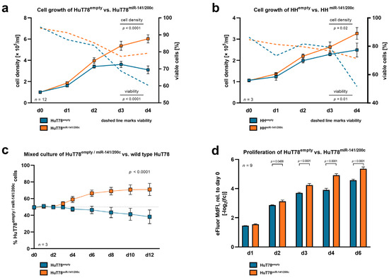 To identify a cellular phenotype associated with miR-141/200c upregulation, we created miR-141/200c-overexpressing T-cell leukemia/lymphoma lines. In the absence of available genuinely T-PLL-derived human cell lines, we used here the lines HuT78 and HH (mature; from CTCL) as well as MOLT-4 and SUP-T11 (naïve; from T-acute lymphoblastic leukemia (T-ALL)) for further studies. As basal expression of the miR-141/200c cluster was (in contrast to T-PLL) generally low in the T-cell leukemia/lymphoma cell lines and in healthy donor T cells, we opted for overexpression of miR-141/200c (instead of knocking it down) in the T-cell lines to induce a T-PLL-like miR-141/200c-related gene expression signature (Figure S1a,b). For this, we introduced a vector leading to stable miR-141/200c overexpression or an empty control vector into these cell lines via lentiviral transduction (see Supplementary Methods Section for details on plasmid mutagenesis). Notably, miR-141/200c-overexpressing HuT78 and HH cells exhibited an enhanced cell proliferation (HuT78: p < 0.0001; HH: p = 0.02; two-way ANOVA) accompanied by higher viability in serum-starved conditions (HuT78: p < 0.0001; HH: p = 0.01; two-way ANOVA), compared to their respective empty-vector controls (Figure 2a,b). To further substantiate the pro-proliferative effects of miR-141/200c overexpression, we performed competitive mixed cultures of miR-141/200c-transduced or empty-vector HuT78 cells (and, therefore, GFP-positive cells) with wild-type (wt, GFP-negative) HuT78 cells in serum-starved culture medium.