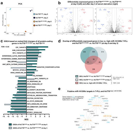Overexpression of miR-141/200c shapes a pro-oncogenic transcriptome of the mature T-cell lymphoma line HuT78, resembling alterations seen in T-PLL cases. Analyses of differentially expressed genes comparing HuT78miR-141/200c vs. HuT78empty cells, without serum starvation (day 0 (d0)) and after three days of serum starvation (RPMI + 1% FBS; d3). For each time point, three technical replicates were sequenced for each transduced cell line. (a) Principal component analysis (PCA) based on all mRNAs. Separate clustering of the four different conditions indicated global differences in the transcriptome, which were induced by upregulation of the miR-141/200c cluster (principal component 2, 22% variance) and by serum starvation (principal component 1, 45% variance). (b) Volcano plots of all expressed mRNAs comparing HuT78miR-141/200c vs. HuT78empty cells at d0 (left) and d3 (right). The horizontal dashed line indicates an FDR of 0.01. The black vertical dashed lines mark an fc of 0.5 and 2; the light grey vertical line marks an fc of 1. Exemplary genes are highlighted in blue (downregulation) or red (upregulation) [31,32]. (c) GSEA (HALLMARK gene sets), based on the complete list of fold changes of all protein-coding genes comparing HuT78miR-141/200c vs. HuT78empty cells (FDR < 0.05, Kolmogorov–Smirnov test). The dark green bars indicate differentially enriched HALLMARK gene sets at d0, and the light green bars indicate them at d3. (d) Venn diagram showing overlapping genes comparing HuT78miR-141/200c vs. HuT78empty cells at d0 and d3 (fc < 0.5 or fc > 2; FDR < 0.01), as well as the high miR-141/200c T-PLL subset vs. the low-miR141/200c T-PLL subset (FDR < 0.05). In total, 54 genes presented a differential expression in all three conditions. (e) Network of predicted targets (by seed sequences, see Section 2 for details), correlating negatively with miR-141/200c expression in miR-141/200c-modulated HuT78 cells and in T-PLL cells (p < 0.05, Spearman correlation). Font color represents a differential expression of miR/mRNA comparing T-PLL cells (n = 48 cases) and healthy donor-derived CD3+ pan-T cells (n = 6 donors; blue = lower expression; red = higher expression, based on our previously published RNA-seq data [6]). STAT4 emerges as a target of the miR-141/200c cluster. Heatmaps showing the top 50 differentially expressed genes comparing HuT78miR-141/200c vs. HuT78empty cells at d0 and d3, as well as heatmaps of core-enriched genes of exemplary HALLMARK gene sets are presented in Supplementary Figure S2. Differentially expressed genes and respective GSEAs upon serum starvation are displayed in Supplementary Figure S3. Supplementary Table S3 summarizes differential gene expression and deregulated GSEA pathways between HuT78empty and HuT78miR-141/200c cells at day 0 and day 3. Supplementary Table S4 summarizes differential gene expression and deregulated GSEA pathways at day 3 vs. at day 0 of serum starvation in HuT78empty or HuT78miR-141/200c cells.