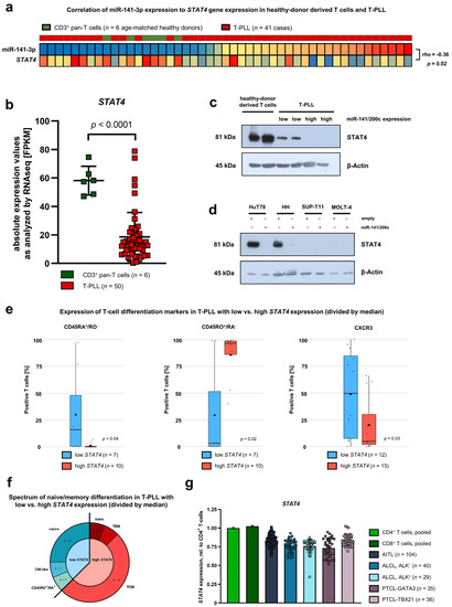 As the miR target prediction revealed STAT4 to be a putative target of miR-141-3p and as STAT4 was among the top deregulated genes in miR-141/200c-overexpressing HuT78 cells, we sought to further characterize STAT4 expression in T-PLL, focusing on its relation to miR-141/200c levels. In line with being a putative miR-141-3p target mRNA, STAT4 gene expression negatively correlated with miR-141-3p expression in T-PLL and healthy donor-derived T-cell controls (rho = −0.36, p = 0.02, Figure 4a). Furthermore, STAT4 levels were generally lower in T-PLL as compared to healthy donor CD3+ pan-T cells (Figure 4b), with the lowest STAT4 expression values in the miR-141/200c-high T-PLL subset (Figure S4a). We next aimed to substantiate these differences in STAT4 mRNA abundances at the level of protein expression. For this purpose, we first compared STAT4 protein expression between low and high miR-141/200c-expressing T-PLL (Figure 4c). In line with the STAT4 mRNA expression, we identified globally diminished STAT4 protein levels in T-PLL cells, compared to healthy donor-derived T cells. Strikingly, STAT4 protein expression levels were even lower in high miR-141/200c-expressing T-PLL samples, further supporting STAT4 as a target of this miR cluster. Then, we compared STAT4 protein expression between low and high miR-141/200c-expressing T-cell leukemia/lymphoma lines (Figure 4d). Similar to the primary T-PLL cells, enforced miR-141/200c overexpression in HuT78 and HH cells led to loss of STAT4 protein expression. The immature T-ALL cell lines MOLT-4 and SUP-T11, both without an enhanced growth behavior upon miR-141/200c upregulation, did not express STAT4 in either condition, supporting a potential role of STAT4 in the observed miR-141/200c effects.