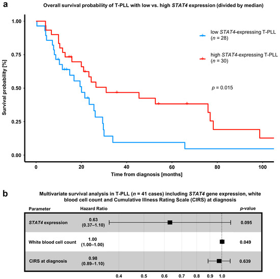 Downregulation of STAT4 mRNA is associated with poor patient outcomes in T-PLL. (a) Overall survival (OS), comparing T-PLL cases with STAT4 mRNA expression higher than the median STAT4 expression of all T-PLL cases (n = 28) to those with lower STAT4 mRNA expression than the median (n = 30). For the evaluation of STAT4 mRNA expression, our previously published gene-expression array data were utilized [6]. Notably, the OS of low STAT4 mRNA-expressing cases (median OS: 20.1 months) was shorter compared to cases with high STAT4 mRNA expression (median OS: 31.0 months, p = 0.02, log-rank test. (b) Multivariate survival analysis in 41 T-PLL cases, assessing the impact of STAT4 gene expression (by gene-expression array data [6]), white blood cell (WBC) count, and Cumulative Illness Rating Scale (CIRS) at diagnosis. Statistical significance was assessed via Cox regression analysis. Outcomes after alemtuzumab-based therapy in association with miR-141/200c or STAT4 expression are presented in Supplementary Figure S6.