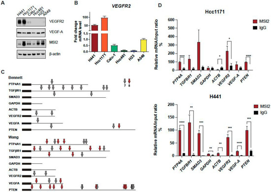 First, we selected human lung adenocarcinoma cell lines with high levels of VEGFR2 expression (H441, Hcc1171, and Calu-1) and A549 as a control with a low level of VEGFR2 expression (Figure 1A,B). MSI2 typically regulates its targets by directly binding to specific motifs in the 3′-UTR fragments of mRNAs [26,27,28]. Therefore, we performed in silico analysis and then validated it through RNA-IP analysis (Figure 1C,D). In silico analysis and RNA-IP validation showed that MSI2 directly binds VEGFR2 but not VEGF-A mRNA. These results expand our knowledge about the role of Musashi-2 in NSCLC progression.