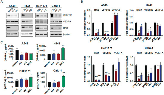 In the light of published papers, we have validated proteomic analysis data that suggested VEGFR2 regulation upon MSI2 depletion in murine lung cancer. We found that MSI2 depletion leads to a strong decrease in VEGFR2 protein levels in murine and human lung adenocarcinoma cell lines. Furthermore, we found that MSI2 protein directly binds to VEGFR2 and PTEN mRNAs and impacts VEGFR2 downstream signaling via PTEN regulation. Finally, MSI2 protein expression correlated with VEGFR2 and VEGF-A protein levels in NSCLC patient samples.