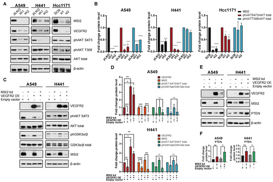 Wang et al. [27] previously showed that MSI2 inhibits PTEN protein levels in murine intestinal epithelia. Based on that, the evaluation of PTEN levels with MSI2 KD and VEGFR2 OE indicated that PTEN protein levels are increased upon MSI2 KD regardless of the VEGFR2 level (Figure 3E,F). In addition, we showed that MSI2 negatively directly regulates PTEN protein levels (Figure 1C,D, Supplementary Figure S2A). We next performed in silico analysis, which predicted MSI2 binding sites in PTEN mRNA, and such binding was validated using RNA IP/QPCR analysis. Taken together, our data suggest that PTEN is a direct MSI2 target in NSCLC. Therefore, MSI2 affects AKT signaling via direct PTEN mRNA binding, independent of VEGFR2 mRNA regulation.