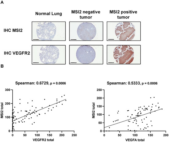 Expression of MSI2, VEGFR2, and VEGF-A proteins in human non-squamous NSCLC patient samples. (A) Representative IHC images of MSI2 and VEGFR2 expression in human normal lungs and lung tumors. (B) MSI2 and VEGF-A (n = 94) and MSI2 and VEGFR2 (n = 116) H score correlation in human NSCLC TMAs.