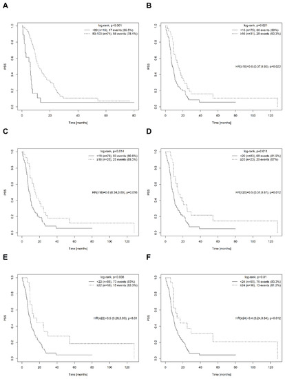 Univariate survival (postsurgical survival-PSS) analysis–estimated Kaplan–Meier survival curves, log-rank test results, and Cox PH model output in the form of point and interval (HR) estimates and significance-test p-values (p) for the Karnofsky score at the time of surgery for the first progression (Surgery-1stPD) (A) and categorized time to progression (TTP) for selected cut-off values (B–F).
