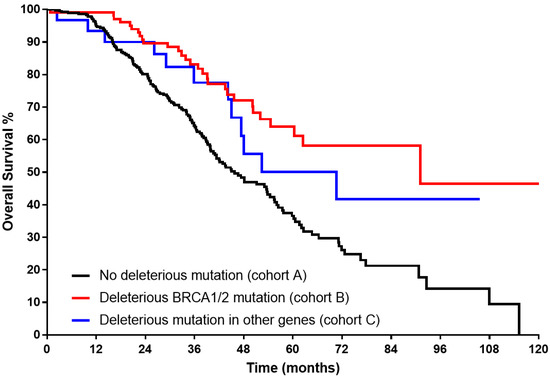 Based on the results of the gene panel testing, our cohort was divided into three groups: (A) no deleterious germline mutation, (B) BRCA1/2 mutation, and (C) other deleterious germline mutation.