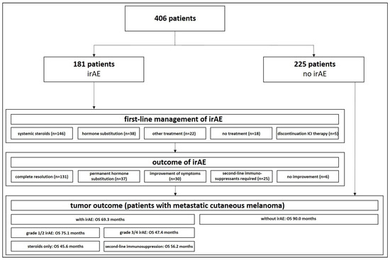 In total, 406 patients (234 males and 172 females) who were treated with ICIs were identified from our registry. The majority of patients were treated for melanoma (n = 389, 95.8%; including cutaneous melanoma, mucosal melanoma, conjunctival melanoma, and uveal melanoma). Other patients had non-melanoma skin cancer (squamous cell carcinoma, basal cell carcinoma, Merkel cell carcinoma, and eccrine porocarcinoma). In 76.4% of cases, the ICI treatment was performed in patients with advanced/metastatic disease, while 21.2% received ICI as an adjuvant therapy after the complete resection of the tumor or were treated in a neoadjuvant setting (0.2%). Most patients (n = 217, 53.4%) were treated with an anti-PD1/PDL1 antibody (cemiplimab, nivolumab, pembrolizumab, or avelumab) or combined anti-CTLA4-antibody and anti-PD1 antibody (n = 173, 42.6%; ipilimumab and nivolumab). In a total of 181 (44.6%) patients, at least one irAE was documented in the patient chart (Figure 1, Table 1).
