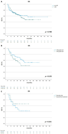 Regarding the management of severe irAEs (Grade 3 and 4), patients who were treated with a second-line immunosuppressant (n = 16) had a longer mean OS of 56.2 months (95% CI 40.5 to 71.9) compared to 45.6 months (95% CI 34.4–56.8) in patients who were only treated with corticosteroids (n = 43, n = 0.321, Figure 3).