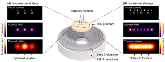 In recent years, novel techniques based on 3D-printed acoustic lenses or holograms used to shape and control the acoustic field have emerged. It has been demonstrated that holographic lenses can compensate for the phase aberrations produced by refracting layers, such as skull bones, producing aberration-corrected focal spots [16] or therapeutic acoustic images of arbitrary shape [17]. Specific biomedical applications of holographically-designed lenses include cell patterning [18], cavitation pattern generation [19], and local blood-brain barrier opening for targeted drug delivery in the brain [20]. Recently, acoustic holograms have been used to generate arbitrary thermal patterns [21]. However, using this approach, the temperature rise is not uniform throughout the whole target.