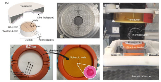 Holographically designed lens, high intensity focused ultrasound transducer, and absorbing gel spheroid holder used in hyperthermia experiments. (A) Schematic of the spheroid exposure system with its dimensions. (B) 3D-printed lens with the holder by which it is mounted on top of the transducer. (C) The mold was used to form the absorbing gel phantom with the three thermocouples located 0.5 mm above the protrusion used to form each well. (D) The mold was filled with IEC tissue-mimicking gel, with 3 miniature wells into which a spheroid could be placed (inset). A gel lid closed the phantom (E) Experimental setup to expose the spheroids to ultrasound hyperthermia.