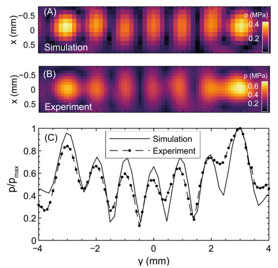 Acoustic pressure field for the seven-focus hologram in the x-y plane at z = 40 mm: (A) simulation (B) experimental hydrophone measurements. (C) normalized hydrophone measured y-axis plot over the pressure maxima.