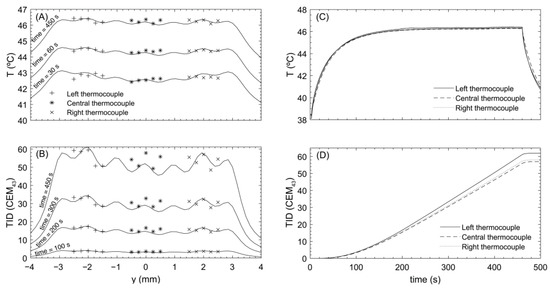 The thermometry system captured the temperature on the thermocouples as a function of time. TID was calculated as [27]