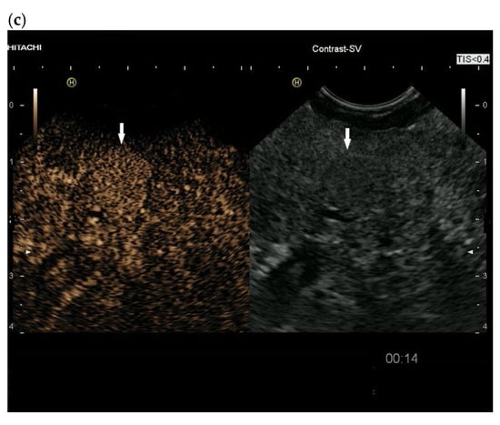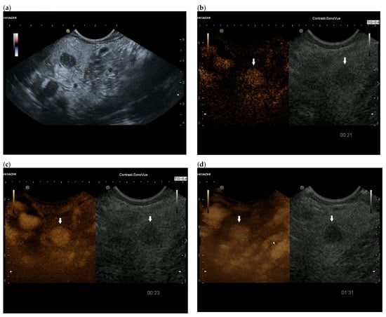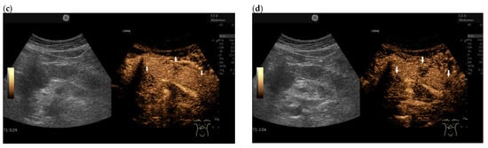 In the study by Dietrich et al. using CEUS and/or CH-EUS, 61% of metastases were hyperenhanced, 11% were isoenhanced, and 28% were hypoenhanced []. The number of RCC was 42.9% [], suggesting that metastases other than RCC may also be hyperenhanced.
