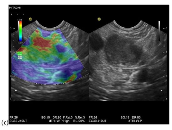 - Ignee, A.; Jenssen, C.; Arcidiacono, P.G.; Hocke, M.; Moller, K.; Saftoiu, A.; Will, U.; Fusaroli, P.; Iglesias-Garcia, J.; Ponnudurai, R.; et al. Endoscopic ultrasound elastography of small solid pancreatic lesions: A multicenter study. Endoscopy 2018, 50, 1071–1079. [Google Scholar] [CrossRef]