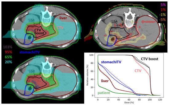 Dose distribution of static plan (upper left), 4DDT dose (lower left), dose difference (upper right) and dose volume histogram (DVH) curves (lower right) of pan13. The solid line in the DVH represents the static dose and the dashed line is the 4DDT dose for the CTVs, stomach and liver.