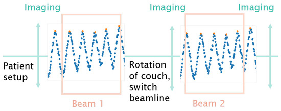 Schematic illustration of the workflow: patient positioning, in-room image acquisition, beam application and potential intermediate and exit imaging. The surface scanner acquisition was interrupted during couch movements caused by a change of the couch positioning, switch between horizontal and vertical beamline or imaging. The start of delivering beam#1 was assumed to be at the 0% breathing phase, while the 4DDT for beam#2 just continued taking the given treatment timeline into account.