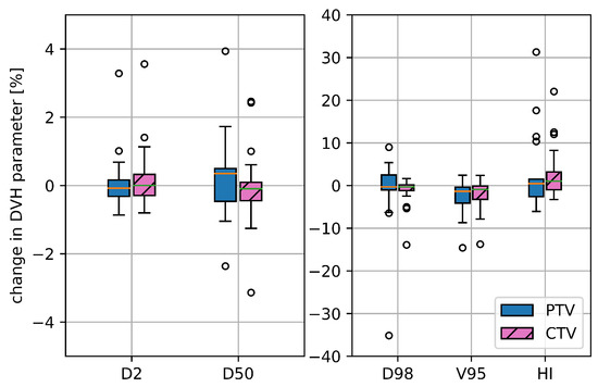 The 4DDT analysis of the rescanned plans (as defined in Section 2.3) versus the simulated non-rescanned plans showed a median of −0.02% and of 0% without any outliers. The median , and was below 0.1% for the PTV and for CTV (shown in Figure 5). For patient pan7 (plan2) rescanning decreased between static and 4DDT from 12.8 to 9.0%, while for the other patients, the difference was within 0.5%.