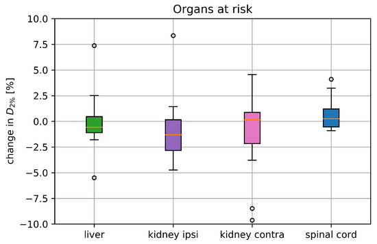 Deterioration of () for the liver, both kidneys and the spinal cord including all 17 treatment plans comparing the static dose distribution with the one retrieved from the 4DDT; parameters where the static was below 1 Gy(RBE) were excluded from the analysis. The boxplots show the median and the quartile values, where the circles represent the outliers.