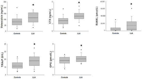 Distribution of bone remodeling markers values, osteocalcin, CTX, RANKL, TRAcP and OPG, measured for healthy and LLA patients. The mean and median values are marked by dotted and black lines, respectively. The superscript * in each box plot indicates statistical difference between the two groups of patients (p < 0.05).