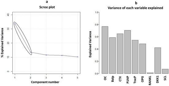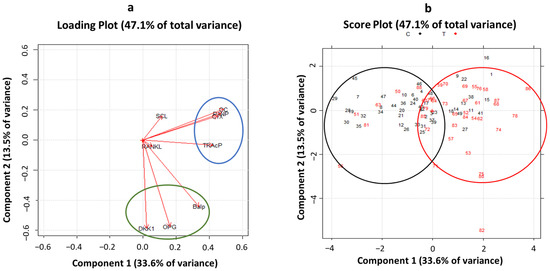 PCA was performed to study all biomarkers in combined analysis to identify patterns and correlations. Considering nine of the main bone turnover and bone remodeling markers, a multivariate approach was used for the whole patient cohort (n = 88). The first step was to perform two preliminary tests to establish the possibility of running a PCA. The first test was the Kaiser–Meyer–Olkin test (KMO test), a measure of sampling adequacy to evaluate whether the variables considered were consistent for the use of a principal component analysis; the KMO test performed on our data set provided an acceptable value of 0.73 (its value ranging from 0 to 1 is consistent above 0.70). The second test was the Bartlett test, performed to test the null hypothesis of non-correlation between variables; it provided a statistically significant result with p < 0.001. Then, the PCA was used to evaluate the number of principal components which explain data variability. Two principal components were fixed as observed by the scree plot (Figure 2a). The first and the second principal component (PC1 and PC2) explained 33.6 and 13.5% of overall variance, respectively. The importance of each bone remodeling marker to build principal components was investigated. Interestingly, as shown in Figure 2b, the osteocalcin, P1NP, and CTX markers each explained more than 60% of variance, followed by bALP, TRACP5b, OPG, and DKK-1. RANKL and sclerostin showed very low relevance in both principal components. These results were confirmed by observing the loading plot in Figure 3. Remodeling markers with longer vectors had a strong weight in the principal components, while markers with short vectors did not have relevance in explaining variability and consequently differences between healthy and ALL patients. Moreover, from the loading plot, correlations between markers were observed. Two strong correlation patterns among the CTX, P1NP, osteocalcin, and TRACP5b markers and among bALP, OPG, and DKK-1 were found (Figure 3, blue and green circles). Considering the score plot (Figure 3), interestingly, the entire cohort of patients showed a clusterization between the controls and ALL patients (black and red circles) along the positive direction of PC1. As clusterization was observed along the first principal component, these results suggest that higher values of the P1NP, osteocalcin, CTX, and TRAcP markers could play a key role in the bone remodeling features of ALL patients with respect to the controls.
