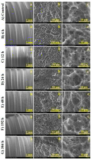 SEM images for Ti screws: macroscopic view (a), microstructure (b) and fine microstructural details (c) exposed to radioactive environment for: (A) control, (B) 6 h, (C) 12 h, (D) 24 h, (E) 48 h, (F) 192 h and (G) 384 h.