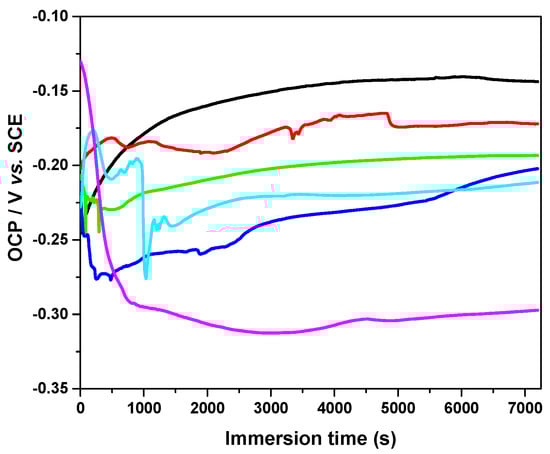 Variation of the open circuit potential of the non-irradiated and irradiated implants exposed for 2 h in artificial saliva solution. Irradiation period (hours): 0 (—); 6 (—); 12 (—); 48 (—); 192 (—); 384 (—).
