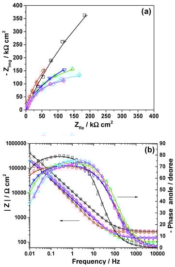 Nyquist (a) and Bode (b) diagrams corresponding to the non-irradiated (□) and irradiated Ti-6Al-4V implant specimens for 6 h (○); 12 h (∆); 48 h (); 192 (◊) and 384 h (⌂) after their exposure for 2 h in the artificial saliva. Symbols correspond to the experimental data and the line with cross (—+—) to the calculated data.