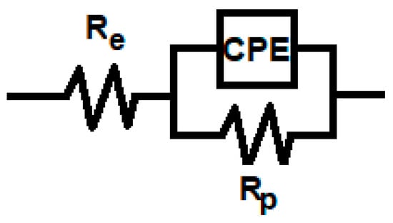 As the impedance spectra from Figure 3 consisted of one-time relaxation constant, the equivalent electrical circuit depicted in Figure 4 was further used to reproduce the experimental data and to extract the corresponding R-Q parameters. As depicted in Table 1, the values of the resistance of the passive film are lower in the case of all irradiated samples as compared to the non-irradiated samples. The smallest Rp values were calculated for the samples which were irradiated for the longest periods (192 h and 384 h). The Q values for the irradiated samples were lower than those corresponding to the untreated one, while the values of n were found within the range of 0.797–0.893, indicating the surface heterogeneity of Ti-6Al-4V samples.