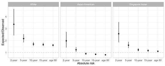 Gao et al. showed in the same dataset that the performance of the Gail model in estimating 5-year absolute risk improved with the use of Singaporean race-specific invasive breast cancer rates and mortality rates for deaths not due to breast cancer [,]. With a longer follow-up time, we were able to extend the work to explore absolute risk predictions for longer time horizons. Similar to the work by Chay et al., we observed good calibration in long-term risk prediction (10 and 15 years) using updated Singaporean estimates of incidence and all-cause mortality rates []. However, changing the incidence and mortality rates did not improve model performance in the shorter term (i.e., 2- and 5-year). As the interval for mammography screening is between one to three years, with two years being the most common, breast cancer risk prediction will bring the most value if the assessments can inform women on how often they should screen [,,]. Good prediction accuracy for short-term risk prediction (<3 years) has been reported for other diseases [,,]. However, these models are built for individuals already at high risk. For example, the chronic kidney disease model was designed for patients with type 2 diabetes, the diabetes model for patients with prediabetes, and the cervical precancer model for individuals infected by human papillomavirus [,,]. While the Gail model appears to identify women at elevated risk of developing breast cancer over a longer period, additional tools that can provide information to screeners on when breast cancer will develop after a high-risk assessment will be the Holy Grail.