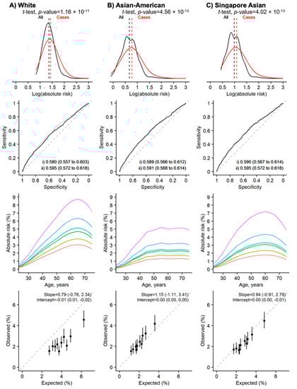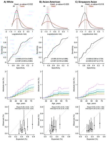 The Gail model (2-year absolute risk) performance assessment. Using the relative risk estimates from the White population [column A], and the closest Asian populations [columns B and C]. The BCRA package’s breast cancer incidence rates and mortality rates were replaced with the rates from Singapore’s population for the right-most panel [column C]. Rows (from top): (1) distribution, (2) discrimination, (3) predictive ability, and (4) calibration by deciles. Two-sided, two-sample t-tests with a type I error of 0.05 were used to examine whether there was a difference in the distribution of the log absolute risk between breast cancer cases and the entire population (row 1, the red and black lines are for cases and non-cases respectively). The Area Under the Receiver Operator Characteristic Curve (AUC) values: (i) unadjusted (solid line), and (ii) adjusted for age at recruitment (dashed line) (row 2). The colored lines (row 3, from bottom to top) in the plots for predictive ability denote 1-, 20-, 60-, 80-, 95-, and 99-percentile of the absolute risk. Calibration is calculated based on 2-year absolute risk by deciles in (row 4).
