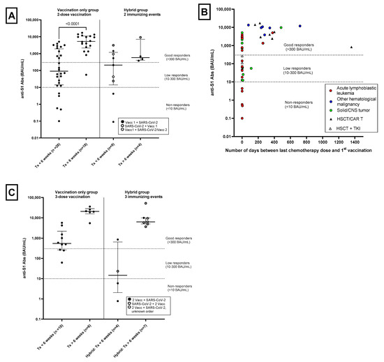 SARS-CoV-2-specific antibody (anti-S1 Abs) levels in patients aged 5–17, vaccinated with a 2- or 3-dose series of BNT162b2 mRNA COVID-19 vaccine or having 2 or 3 immunizing events. The horizontal dashed lines indicates thresholds for: non-responders (<10 BAU/mL), low responders (10–300 BAU/mL) or good responders (>300 BAU/mL). BAU/mL = binding antibody units per milliliter. (A) Anti-S1 antibody levels at 4 weeks after 2-dose vaccination or 2 immunizing events in all patients aged 5–17. Patients were divided into two groups consisting of patients with the last immuno- or chemotherapy dose <6 weeks before 1st vaccination or 1st immunizing event (Tx < 6 weeks) or >6 weeks before 1st vaccination or 1st immunizing event (Tx > 6 weeks). Vaccination Only group: p < 0.001 as determined by the Mann–Whitney U test. In the Hybrid Immunity group, patients were further categorized as having 1 vaccination followed by SARS-CoV-2 infection (black circles), being previously infected with SARS-CoV-2 followed by 1 vaccination dose (grey circles) or 1 vaccination followed by another vaccination and infection that occurred <10 days of each other counting as 1 immunizing event (open circles). (B) Anti-S1 antibody levels at 4 weeks after 2-dose vaccination in all patients aged 5–17 years without a history of SARS-CoV-2 infection and the number of days between last immuno- or chemotherapy dose and 1st vaccination. Red circles indicate patients with acute lymphoblastic leukemia; blue circles, patients with other hematological malignancies; green circles, patients with a solid or central nervous system tumor; black triangles, patients with a history of HSCT and/or CAR T-cell therapy; white triangles, patients with a history of HSCT who were being treated with a tyrosine kinase inhibitor (TKI). (C) Anti-S1 antibody levels at 4 weeks after 3-dose vaccination in patients aged 12–17 years or 3 immunizing events in patients aged 5–17 years. Patients were divided into two groups consisting of patients with the last immuno- or chemotherapy dose < 6 weeks before 1st vaccination or 1st immunizing event (Tx < 6 weeks) or >6 weeks before 1st vaccination or 1st immunizing event (Tx > 6 weeks). In the Hybrid Immunity group, patients were further categorized as having 2 vaccinations followed by SARS-CoV-2 infection (black circles), being previously infected with SARS-CoV-2 followed by 2-dose vaccination (grey circles) or an unknown order of 2-dose vaccination + SARS-CoV-2 infection (open circles).