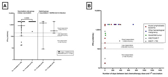 The amount of interferon-gamma (IFN-γ) released by SARS-CoV-2-specific T-cells in patients aged 5–17, 4 weeks after a 2-dose series of BNT162b2 mRNA COVID-19 vaccine or 2 immunizing events. The horizontal dashed lines indicates: non-responders (<100 mIU/mL), low responders (100–200 mIU/mL) or good responders (>200 mIU/mL). mIU/mL= milli-international units per milliliter. (A) SARS-CoV-2-specific T-cell response in the Vaccination Only group and the Hybrid group (1 vaccination followed by a SARS-CoV-2 infection). Patients were divided into two groups consisting of patients with the last dose of immuno- or chemotherapy <6 weeks before 1st vaccination or 1st immunizing event (Tx < 6 weeks) or >6 weeks before 1st vaccination or 1st immunizing event (Tx > 6 weeks). Vaccination Only group: p = 0.0083 as determined by Mann–Whitney U test. One patient in the Vaccination Only Tx < 6 weeks group with a value of 0 mIU/mL is not depicted. (B) SARS-CoV-2-specific T-cell response and the number of days between last immuno- or chemotherapy dose and 1st vaccination in patients aged 5–17 years without a history of SARS-CoV-2 infection. Red circles indicate patients with acute lymphoblastic leukemia; blue circles, patients with other hematological malignancies; green circles, patients with a solid tumor or central nervous system tumor; black triangles, patients with a history of HSCT and/or CAR T-cell therapy; white triangles, patients with a history of HSCT who were being treated with a tyrosine kinase inhibitor (TKI). One patient with a value of 0 mIU/mL and 1 day between his last chemotherapy and first vaccination is not depicted.