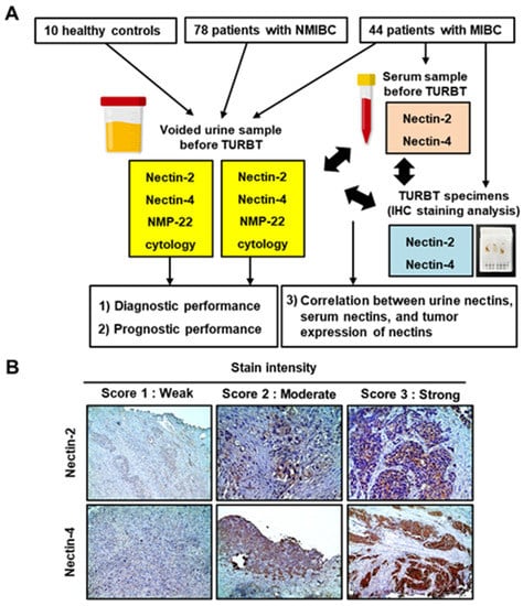 The study design and immunohistochemical staining analysis of Nectin-2 and Nectin-4. (A) Flowchart showing the study design. Study participants included 10 healthy controls, 78 patients with NMIBC, and 44 patients with MIBC. Pre-TURBT-voided urine samples were subjected to ELISA to measure Nectin-2, Nectin-4, and NMP-22 levels. Pre-TURBT serum samples were subjected to ELISA to measure Nectin-2 and Nectin-4. Paraffin-embedded formalin-fixed tissues from TURBT specimens were subjected to immunohistochemical staining analyses. (B) Representative images of the staining intensity (scores 1–3) of Nectin-2 and Nectin-4 in MIBC. Nectins are predominantly expressed in the membrane and the cytoplasm of urothelial carcinoma cells. Images were captured at ×100 or ×200 magnifications. Abbreviations: TURBT, transurethral resection of bladder tumor; NMIBC, non-muscle MIBC, muscle-invasive bladder cancer; IHC, immunohistochemistry.